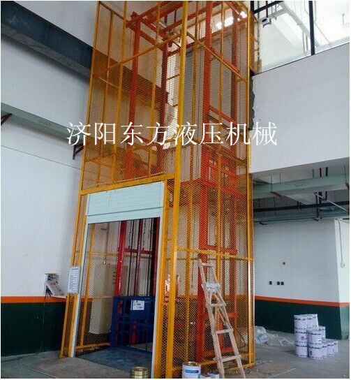 导轨式升降平台是一种垂直升降作业的简易升降平台。此设备采用液压油缸顶升、链条及钢丝绳拉动工作台,起升到目标高度后,通过限位开关自动与楼层平层。