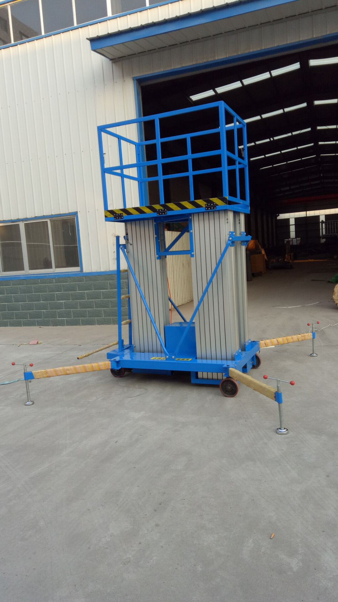 高强度铝合金桅柱升降平台,整机重量轻,机动性好,适合单人操作;特制的桅柱间导轮装置升降平稳自如;结构紧凑,运输状态尺寸小,可进入一般的轿厢以及能顺利通过门洞和狭小通道;双重保护的支腿结构,工作更安全,且可贴近工作面升降作业。