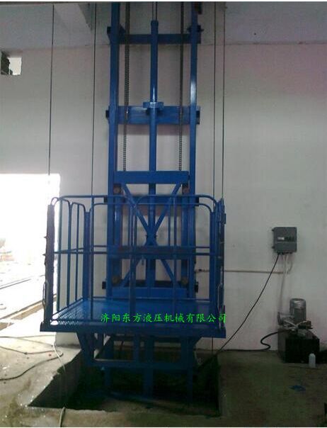 液压货梯是一种垂直升降作业的简易升降平台。此设备采用液压油缸顶升、链条及钢丝绳拉动工作台的升降结构,所以又叫做导轨式液压升降货梯,起升到目标高度后,通过限位开关自动与楼层平层。