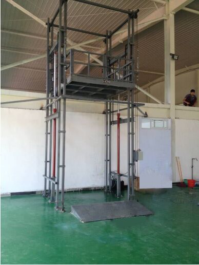 导轨式升降平台是一种垂直升降作业的简易升降平台。此设备采用液压油缸顶升、链条及钢丝绳拉动工作台,起升到目标高度后,通过限位开关自动与楼层平层。